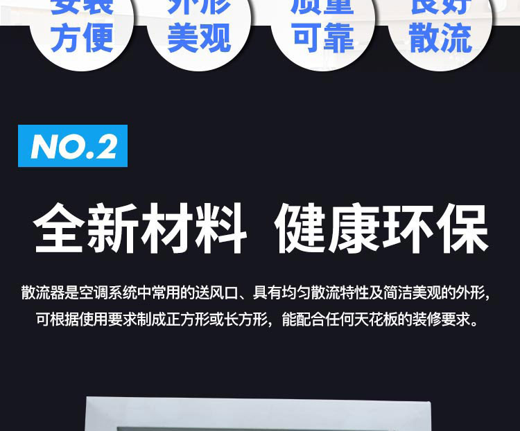 鋁質(zhì)散流器外框和內(nèi)芯采用優(yōu)質(zhì)金型材制作,并經(jīng)本色陽極化處理,陽極化膜堅實耐腐蝕。也可根據(jù)用戶要求進行噴漆或著色處理。散流器外觀輪廓明顯,表面光潔明亮。本散流器,氣流屬貼附(平送)型。