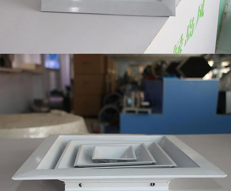 方型散流器使用該類型散流器時要與調(diào)節(jié)閥配合使用,才能在系統(tǒng)中得到理想的氣流分布。此風口的葉片角度為固定式,不能隨意調(diào)節(jié),整個葉片與邊框采用分離結(jié)構(gòu)