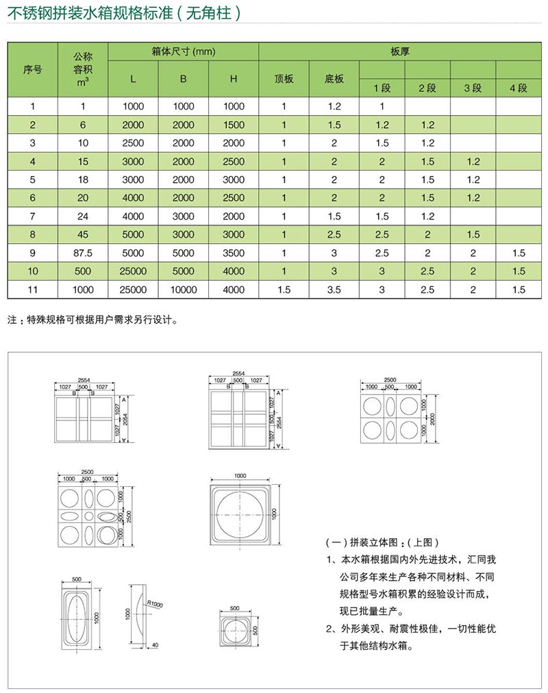 不銹鋼水箱系列產品其單板規格:500×500mm、1000×500mm、 1000×1000mm,水箱可任意拼裝成1-1500噸,